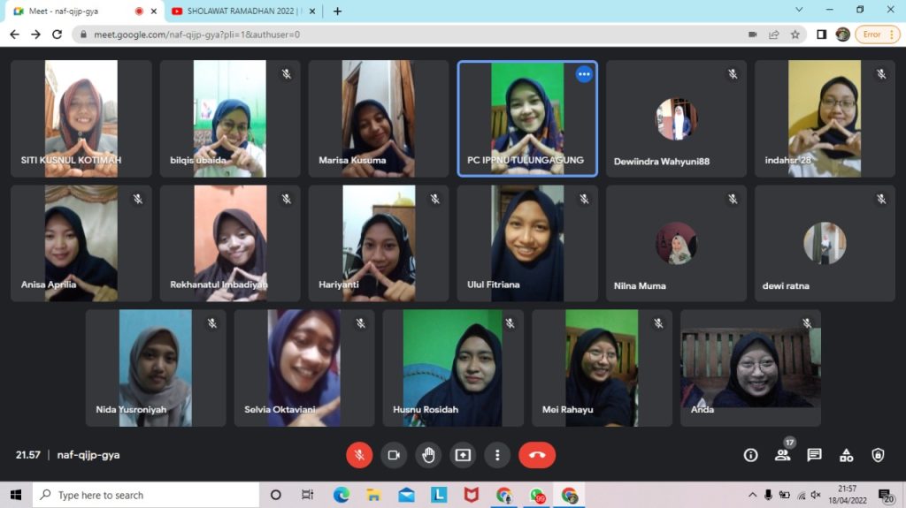 Tulungagung,pcipnu-ippnutulungagung.or.id-Sapa Rekanita merupakan kegiatan talkshow rutin bulanan dari PC IPPNU Tulungagung. Bertepatan dengan bulan suci Ramadhan, Sapa Rekanita yang biasanya berisi talkshow ini dikemas berbeda yaitu dilengkapi dengan khataman Al-Qur’an. Kegiatan ini sudah berjalan dari bulan-bulan sebelumnya dan kini tengah menginjak Sapa Rekanita Batch 5. Pelaksanaan kegiatan ini dilakukan secara virtual meeting room pada Senin (18/04/2022). Narasumber kali ini yaitu Siti Kusnul Kotimah yang merupakan ketua Majelis Alumni (MA) IPPNU Tulungagung dan menjabat sebagai ketua PC Fatayat NU Tulungagung.