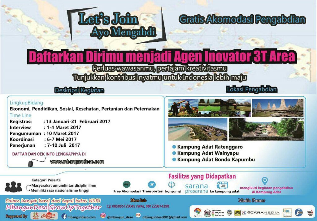 Ingin mengabdi kepelosok negeri sekaligus menikmati indah nya pesona alam dan budaya di Sumba??? Yuk segera daftar kan dirimu menjadi salah satu agen innovator daerah 3T. Let’s come join “Ayo Mengabdi” dapatkan kesempatan untuk ikut serta melakukan pengabdian di daerah 3T “Sumba Barat Daya”. Akomodasi pengabdian “GRATIS”. Pada sesi ini pengabdian akan dilakukan di 3 kampung adat Sumba : Kampung Adat Ratenggaro, Kampung Adat Bondo Kapumbu dan Kampung Adat Wainyapu selama 4 hari pada tanggal 7-10 Juli 2017. Perluas wawasanmu pertajam kreativitas mu dan jadilah agen perubahan untuk daerah 3T. Kegiatan ini terbuka untuk masayrakat umum lintas disiplin ilmu dan bertujuan untuk mengembangkan potensi lokal daerah 3T.