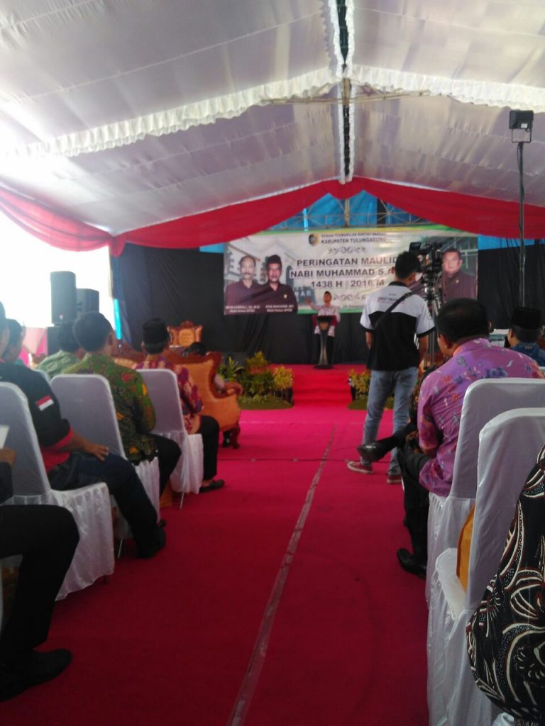 Hari Kamis (29/12) sekitar pukul 09.30 tadi pagi acara dimulai, acara dalam rangka memperingati maulid Nabi Muhammad SAW 1438 H, yg diselenggarakan oleh Dewan Perwakilan Rakyat Daerah (DPRD) Tulungagung yang bertempat di Halaman kantor DPRD Tulungagung. Dihadiri dari berbagai kalangan pemerintahan Kabupaten Tulungagung, FORPIMDA maupun tokoh masyarakat dan agama serta berbagai organisasi kepemudaan (OKP) bahkan perguruan tinggi di Tulungagung. Pra acara dimeriahkan oleh sholawat dari Kementrian Agama Tulungagung yang suaranya seperti Golden Voice, sudah tidak diragukan lagi tingkat juaranya. Acara dimulai dengan menyayikan lagu indonesia raya, pembacaan ayat suci al-Qur’an oleh Ust. Misbahul Anam, setelah itu dilanjutkan dengan sambutan. Yang pertama yaitu dari ketua DPRD Tulungagung yaitu Bapak Supriono, SE. M.Si, yang kedua Wakil Bupati Tulungagung yaitu Drs. Maryoto Birowo, MM dan Mauidloh Hasanah oleh KH. Khoirul Rokhim pengasuh Pondok Pesantren Darul Ulum Desa Ngungahan Kecamatan Bandung dan diakhiri dengan doa. Dalam sambutannya, selaku ketua DPRD beliau mengatakan kegitan ini untuk menyanjung baginda Rosululloh SAW karena beliau adalah panutan kita semua, semoga kegiatan ini tetap dibudayakan dari tahun ke tahun dikalangan pemerintah yg notabane adalah setir roda kemasyarakatan, beliau juga mengucapkn terimaksih atas kehadiran tokoh agama dari Nahdlatul Ulama dan Muhammadiyah, dll. Dari PC IPPNU Tulungagung kali ini diwakili oleh rekanita Itma Waritda selaku bendahara umum PC IPPNU Tulungagung dengan didampingi rekanita Santi dan rekanita Niswa. dalam sambutan bapak wabub menjelaskan bahwa sesungguhnya peranan umaro.’ dan Ulama itu sama yaitu mengabdi kepad masyarakat melalui bidang masing-masing, umaro’ dalam bidang kepemerintahan sedangkan ulama bertugas membenahi akidah.